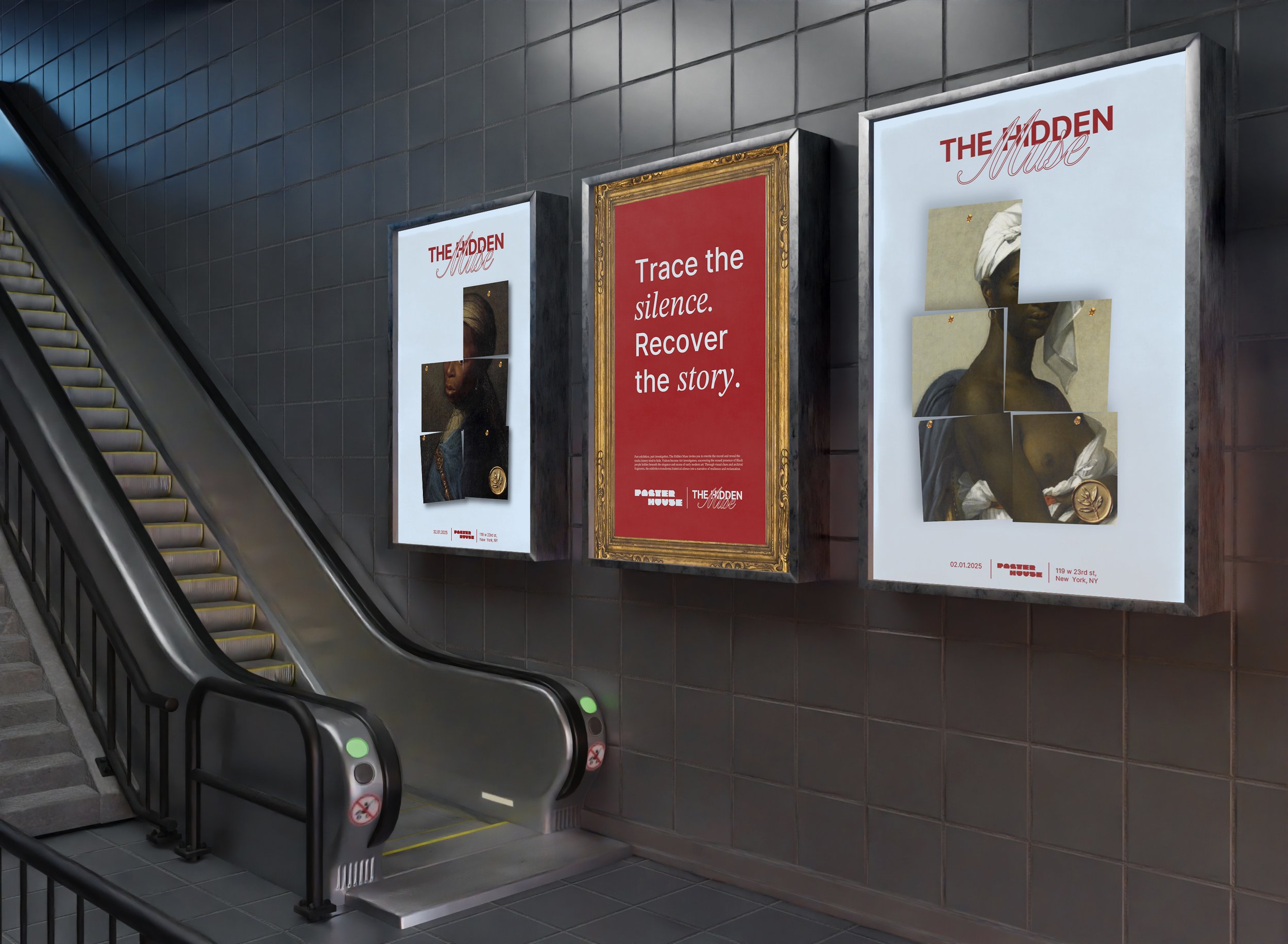 I created a promotional campaign for Hidden Muse that introduces the exhibition’s investigative experience to the public. The visuals use cropped paintings, layered imagery, and clue-like typography to hint at the act of discovery and piecing clues together. Designed for transit spaces and urban environments, the campaign mirrors the exhibition’s investigative nature and invites people to step into the experience before ever entering the gallery.