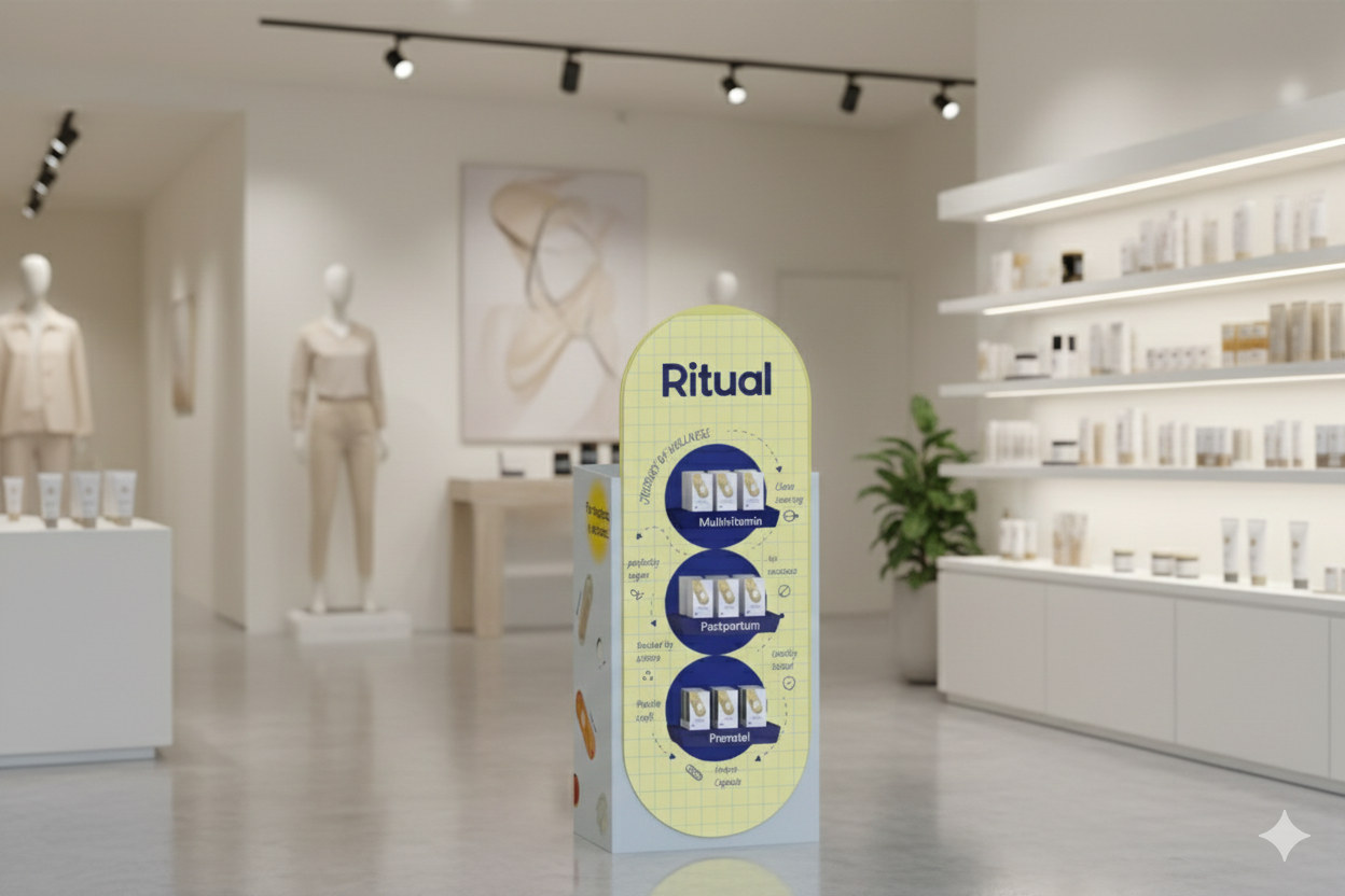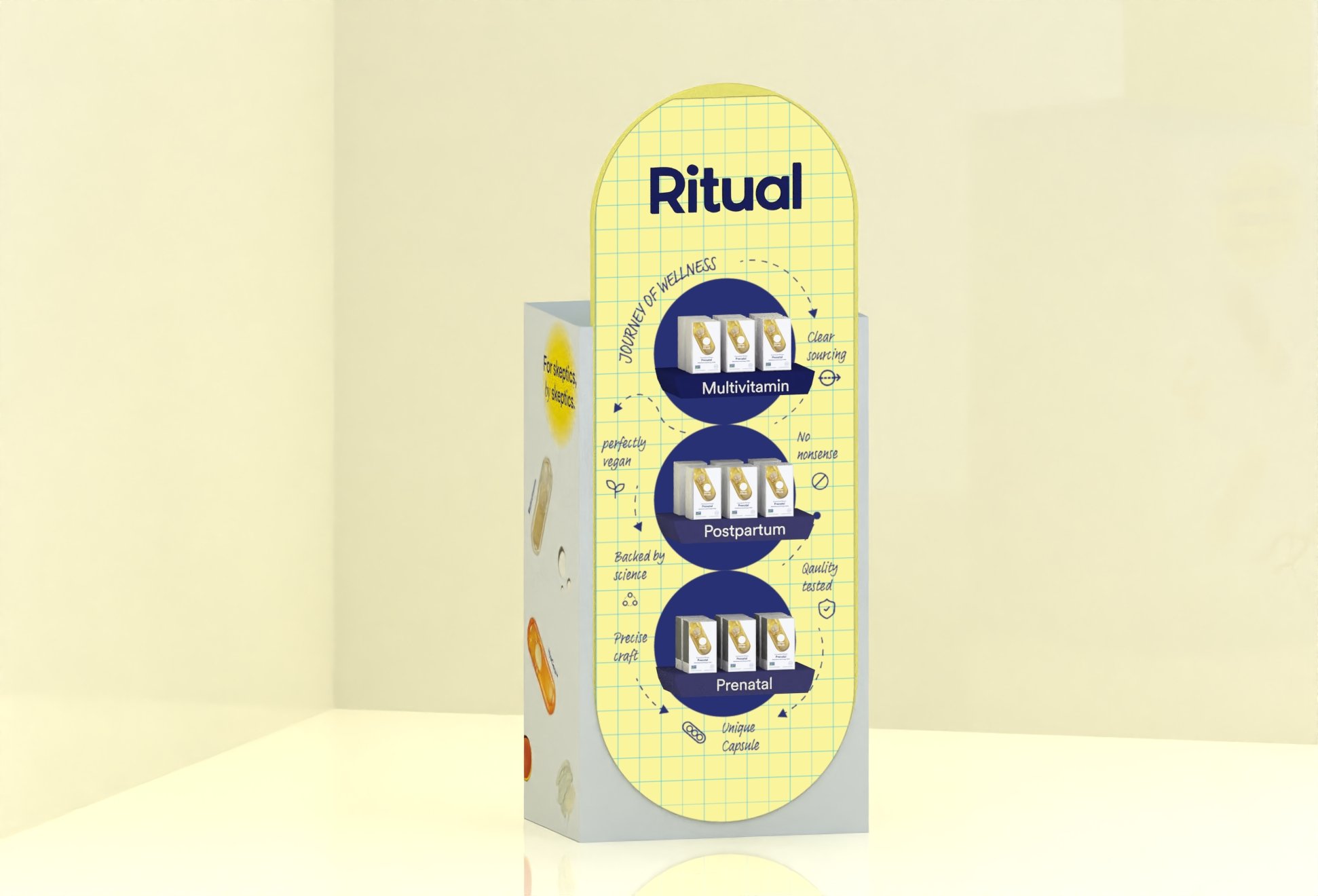 I applied my skills in spatial design and visual communication to translate Ritual’s minimalist and science-driven identity into a physical form. Using flow diagrams, clean lines, and layered transparency, I created a display that reflects the brand's values of clarity, simplicity, and trust.