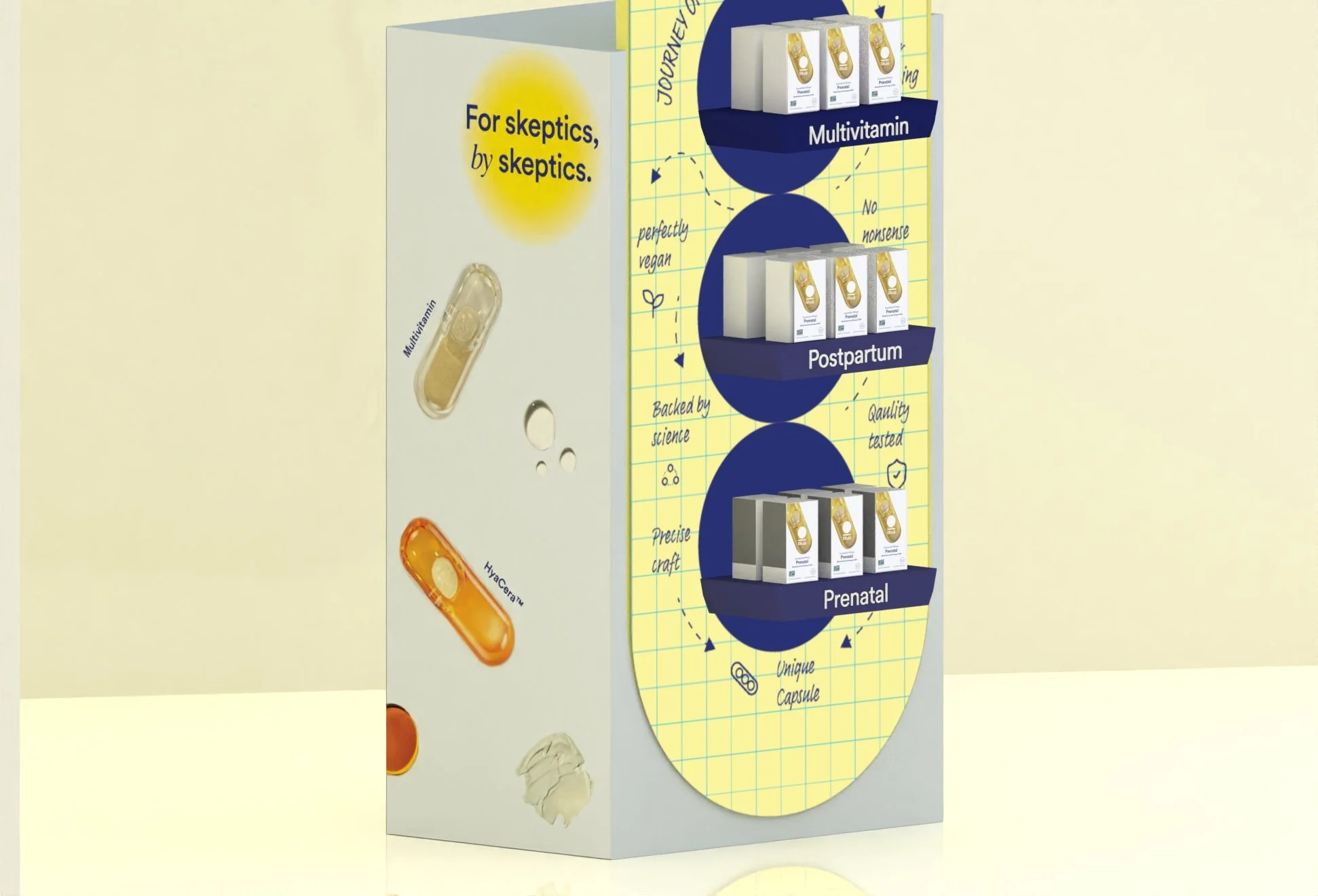 This project focuses on designing a retail display for Ritual that visually communicates the brand’s commitment to transparency and science-backed wellness. I was inspired by their signature vitamin capsules which led me to transforming complex ingredient sourcing and formulation processes into an engaging, educational in-store experience.