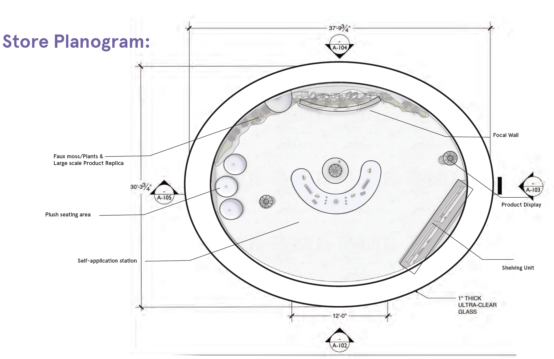 This circular layout is designed to feel open, interactive, and visually engaging. I added a mix of moss, plants, and a scaled product replica to make visitors get an idea of what scent the product evokes.